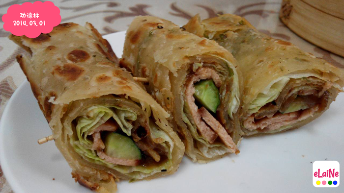 最後上來的是【素香捲餅】,70元三捲,外面的皮煎的很酥,不會過油(這點很重要,值得嘉獎),包上一塊素料跟小黃瓜、生菜,酥酥的捲餅搭上軟軟的素料,又有一點新鮮蔬菜的口感,裡面還有甜麵醬,我喜歡,當然,又是秒殺。
