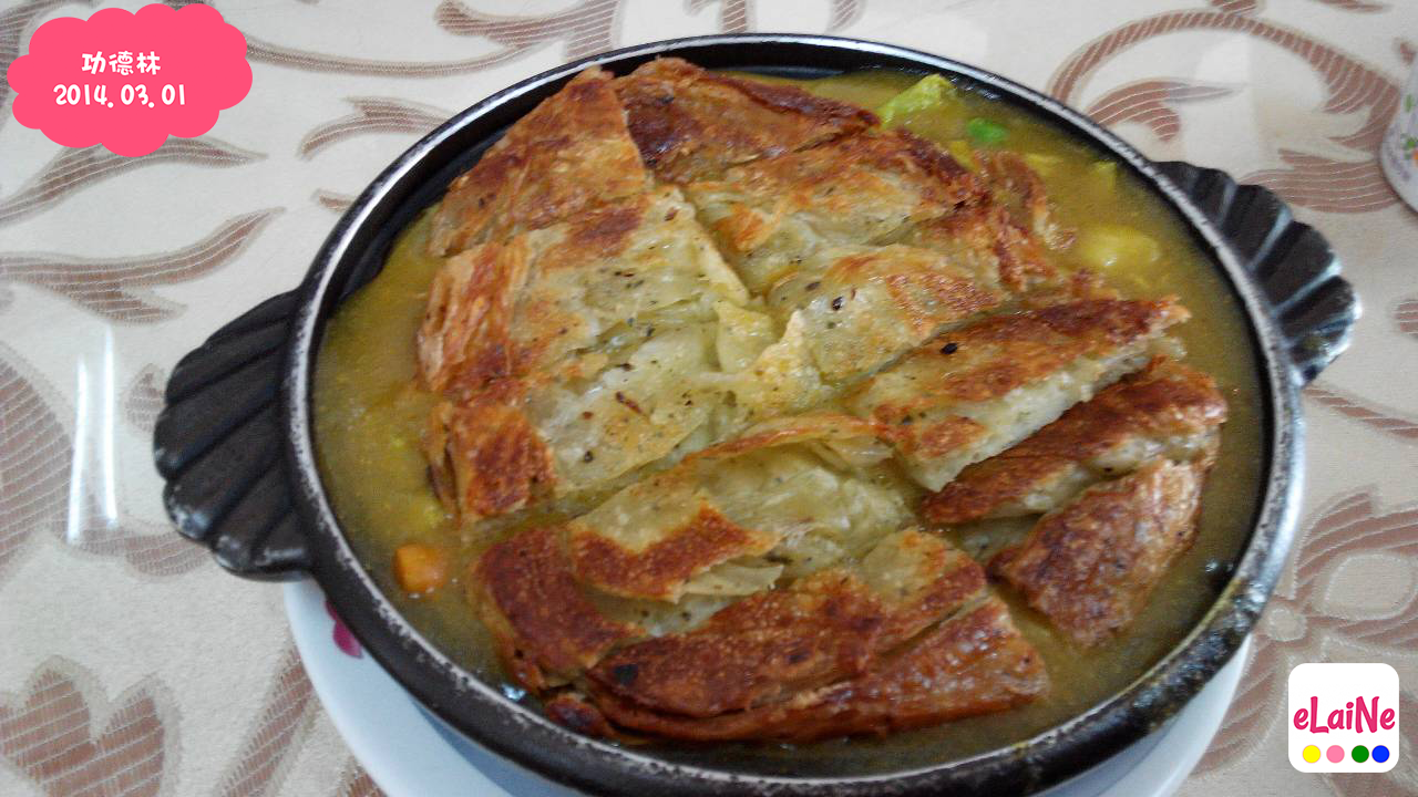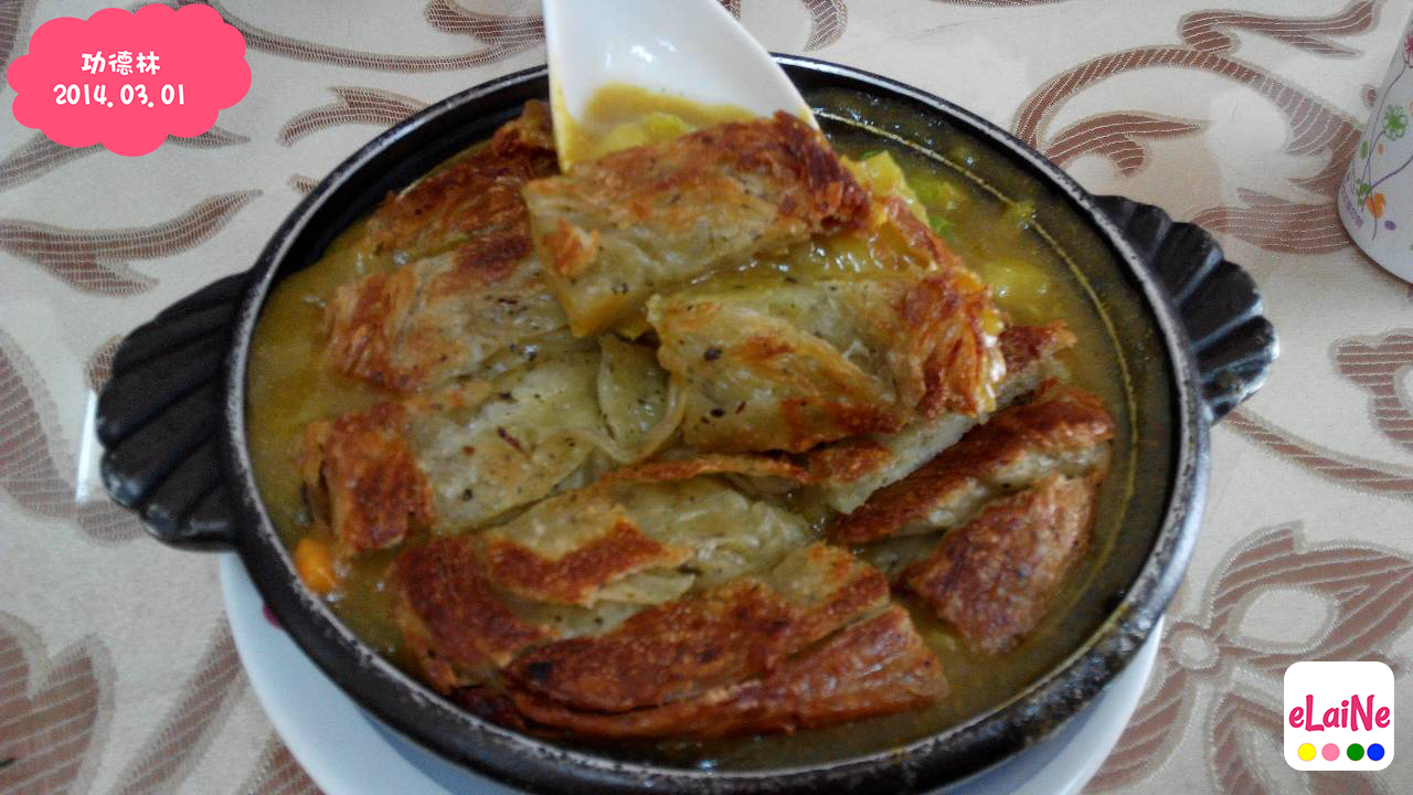 【咖哩炒餅】原來不是真的下鍋炒,而是酥酥脆餅跟放在熱熱的咖哩上面,咖哩裡頭的蔬菜也很多,舀一口,口感跟味覺都很好吃,口味偏重,如果配飯一定也很好吃。
